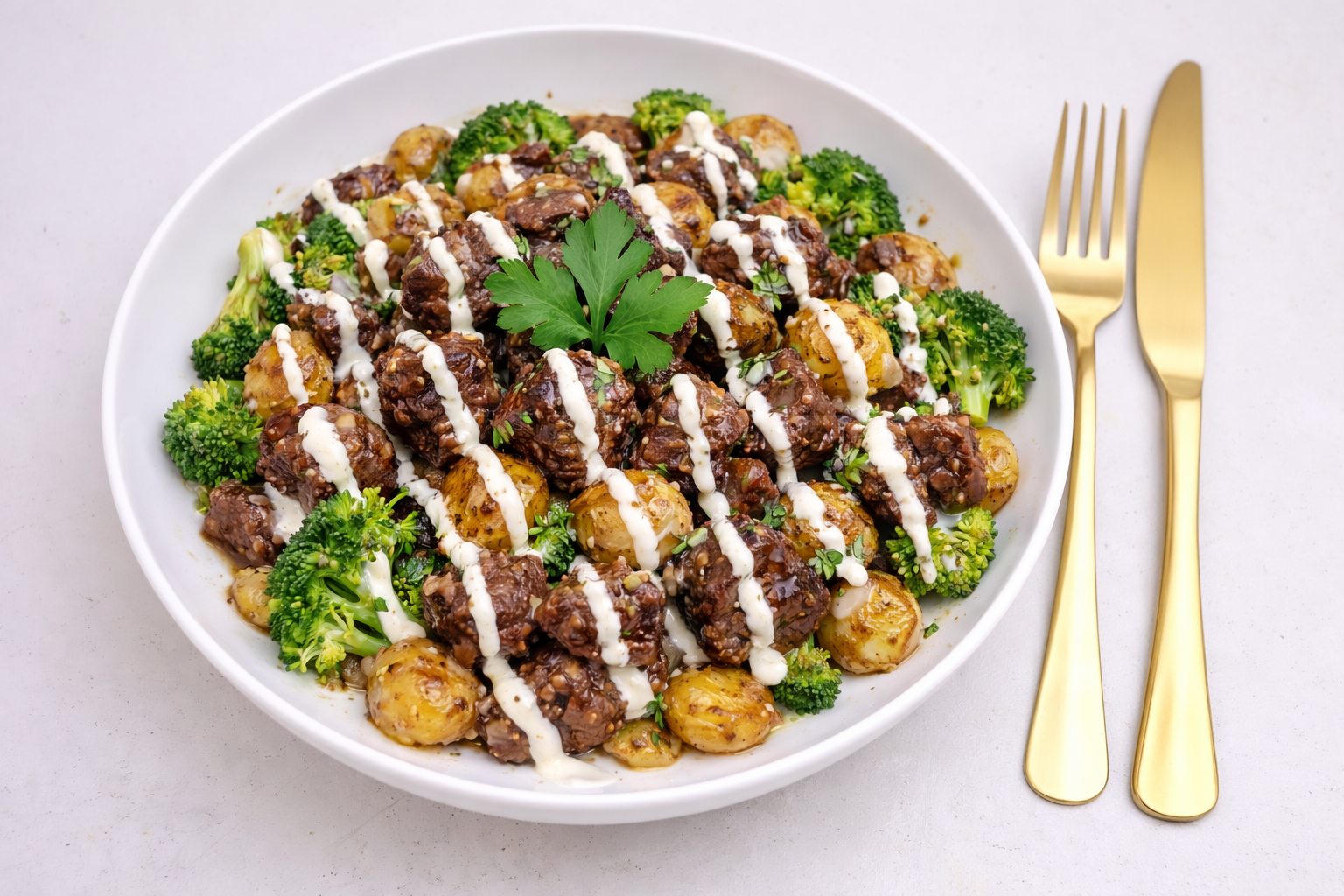 Juicy, tender steak bites paired with golden roasted potatoes and fresh broccoli, finished with a drizzle of our homemade pepper ranch sauce.