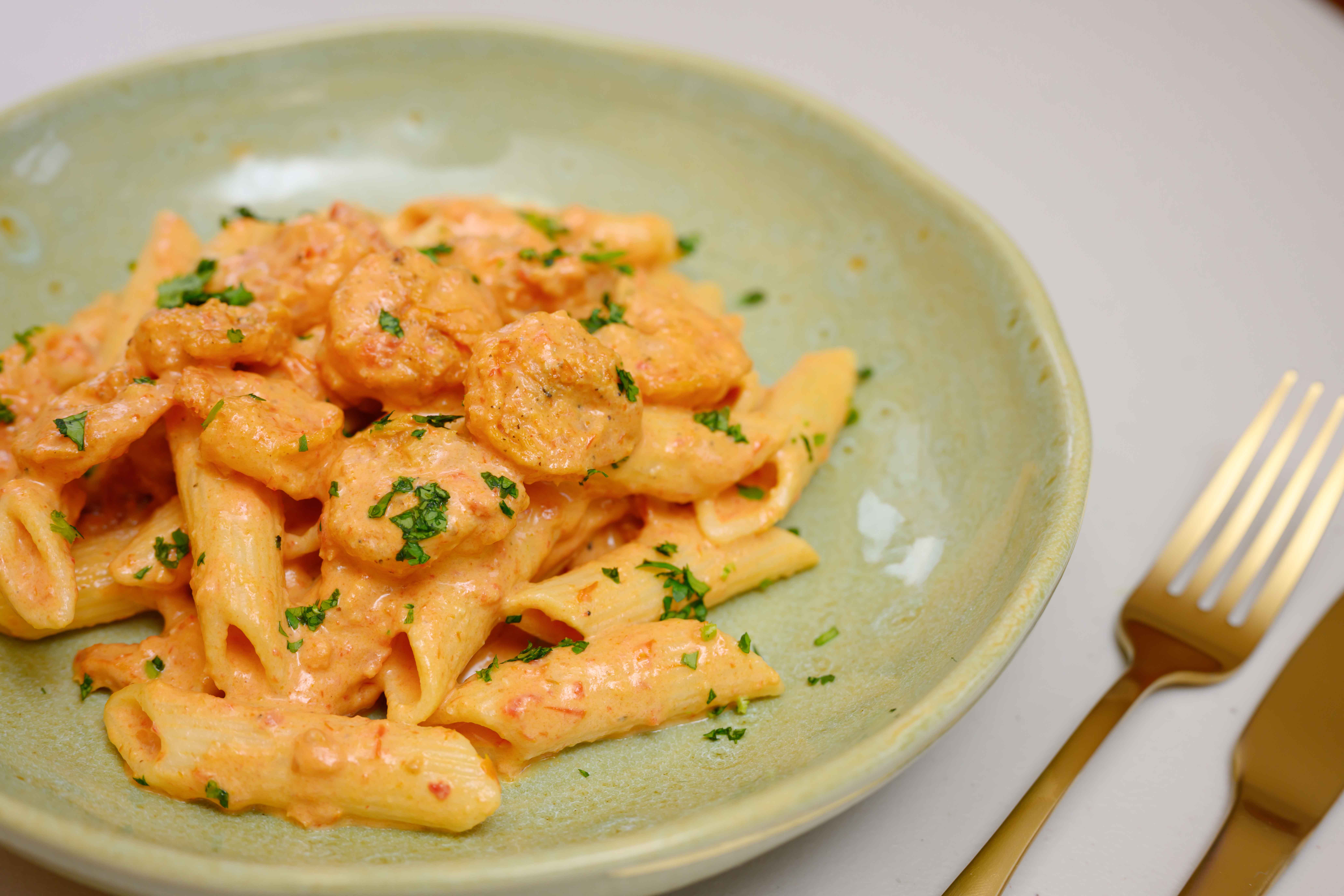 Tender shrimp and penne pasta tossed in a creamy mozzarella rosé sauce with sun-dried tomatoes, basil, and a touch of red pepper flakes for a rich, flavorful bite.