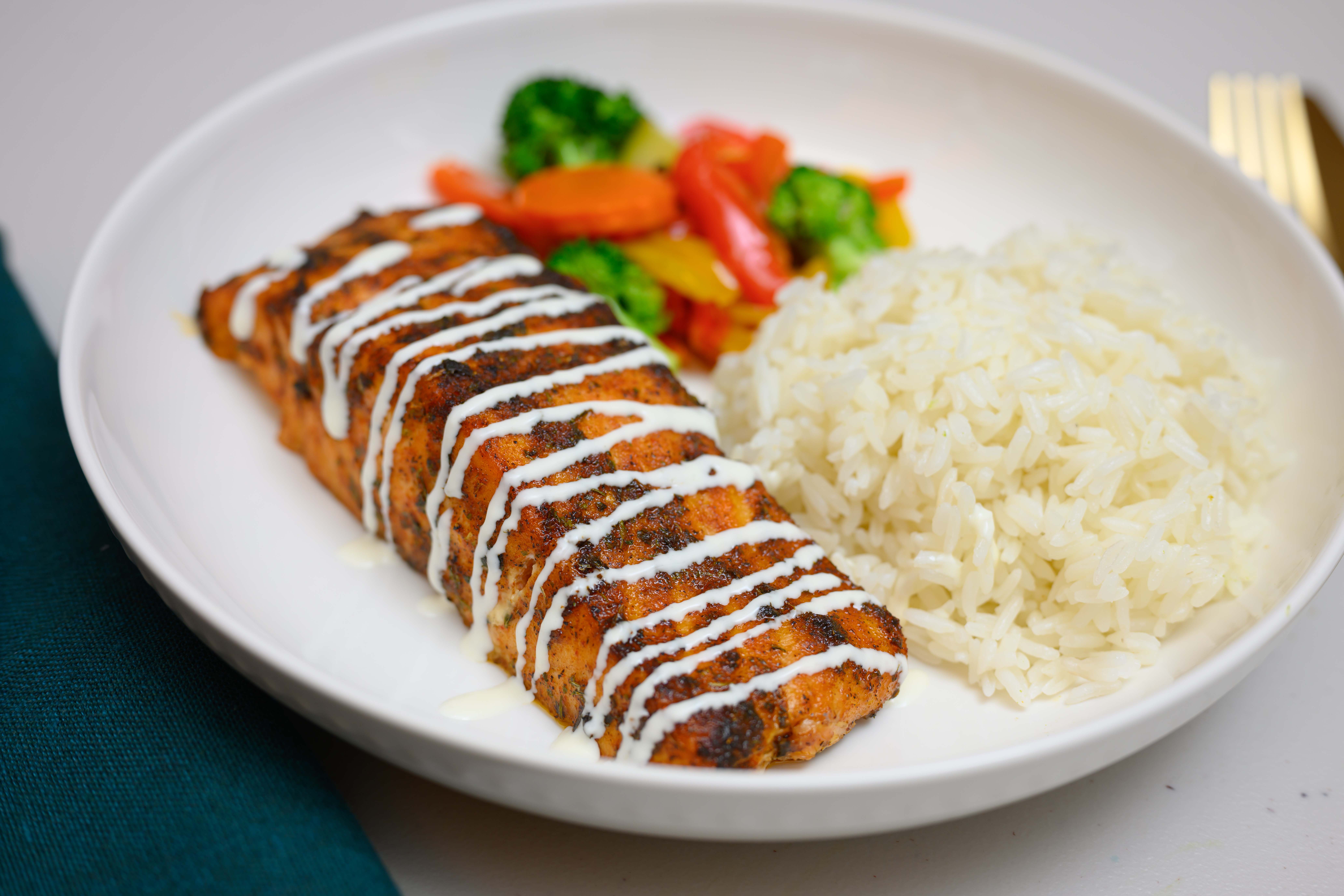 Oven-roasted salmon with jasmine rice and sautéed vegetables, finished with a creamy home made pepper ranch drizzle.