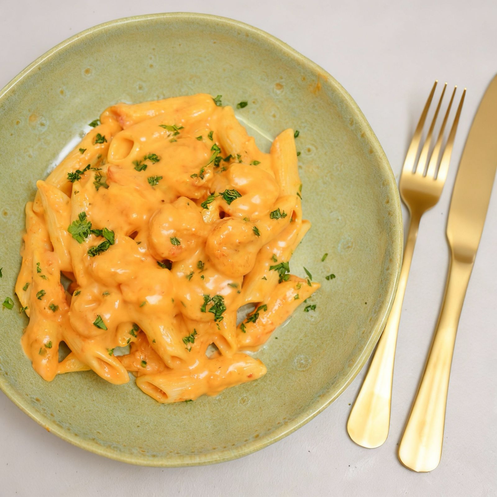 Tender shrimp and penne pasta tossed in a creamy mozzarella rosé sauce with sun-dried tomatoes, basil, and a touch of red pepper flakes for a rich, flavorful bite.