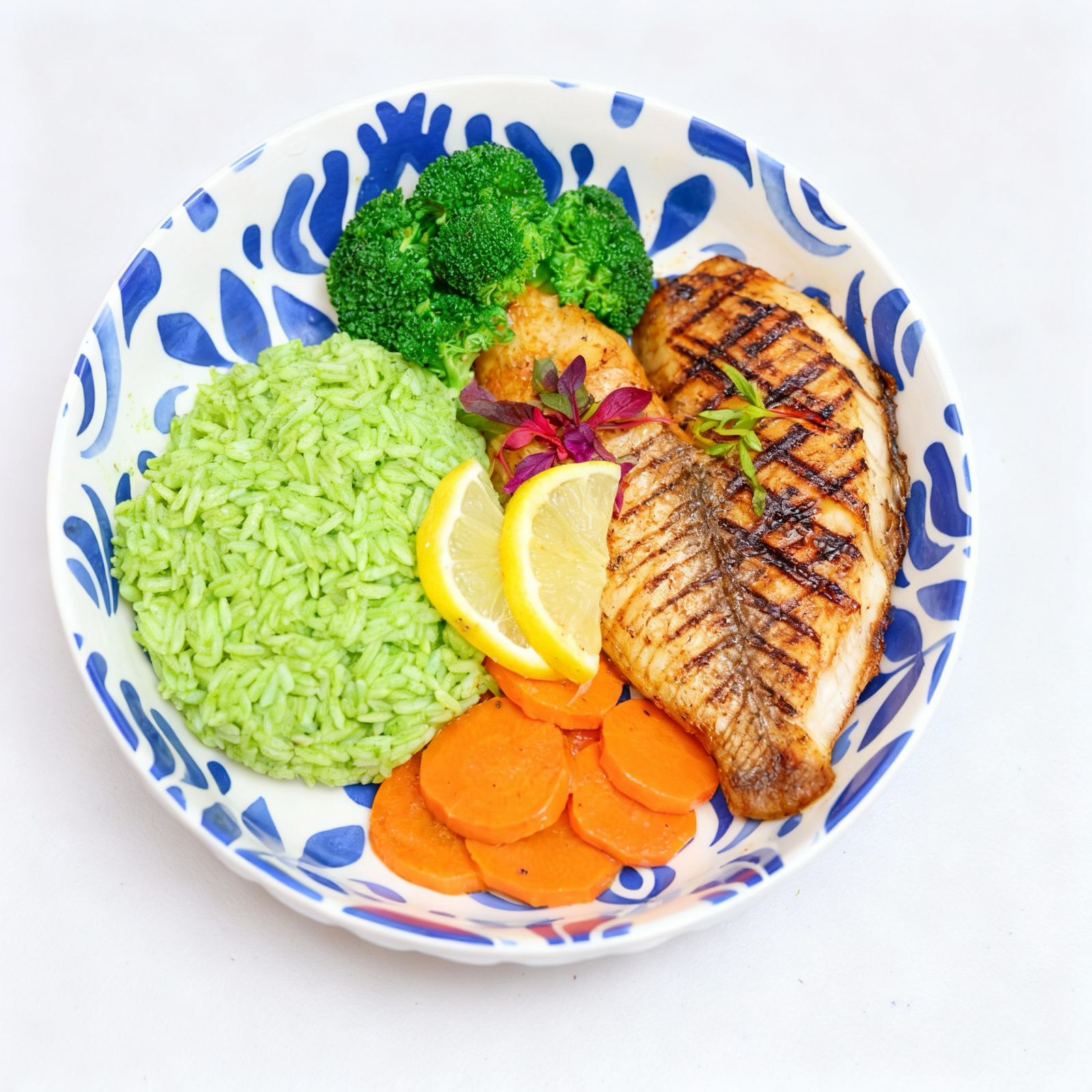White fish fillet with cilantro jasmine rice, steamed broccoli, carrot, and lime.