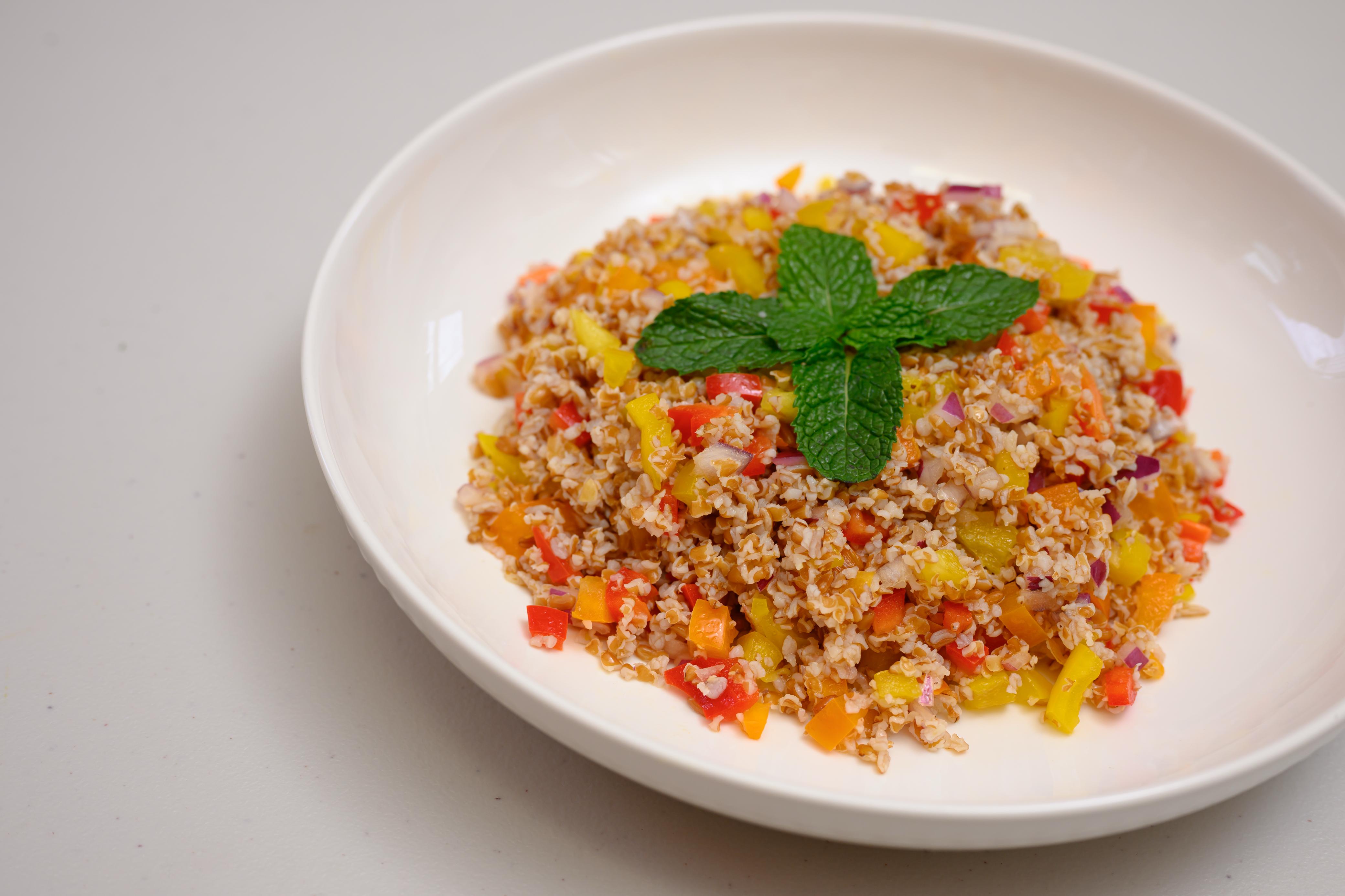 Colorful bulgur bowl with peppers, onion, cucumber, celery, cherry tomato, and a touch of a lime vinaigrette.